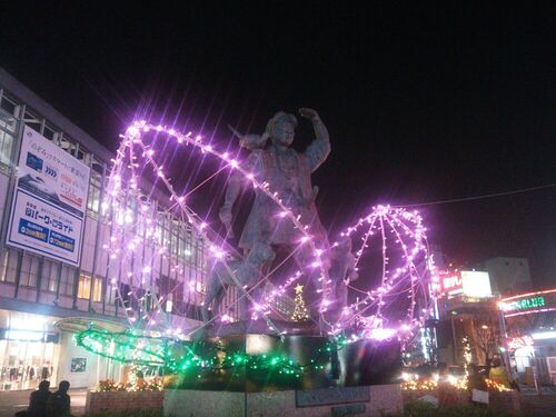 岡山駅前の桃太郎もライトアップ