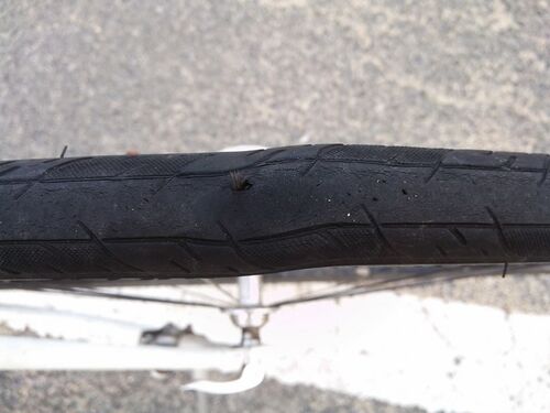 平日の通勤中にも「なんかおかしいなぁ…」と思よったけど、なんかタイヤがおかしな形に変形しとるw コブみたい??? と思ってたら、途中でパンクした。 案の定コブの所に穴が開いてた。 チューブ交換しても、タイヤの方のコブがそのままだとまたパンクする…