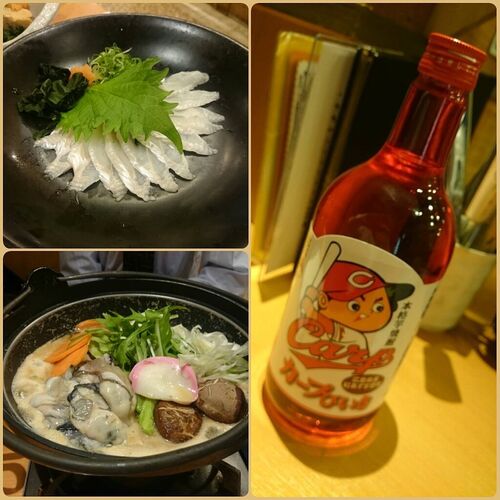穴子の刺身、牡蠣鍋、本格芋焼酎カープびいきと広島を頂いております(^人^)