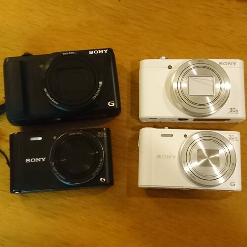 初めて中古のデジカメ(右の白い2つ)買いました 左上のカメラ(HX50V)が、電源入れても「電源を入れ直して下さい」ってエラー表示されるようになって使用不可能に。 左下のカメラ(WX350)は、写真の場合黒点が写り込む事象が発生…動画は問題ないので、雪山専用…