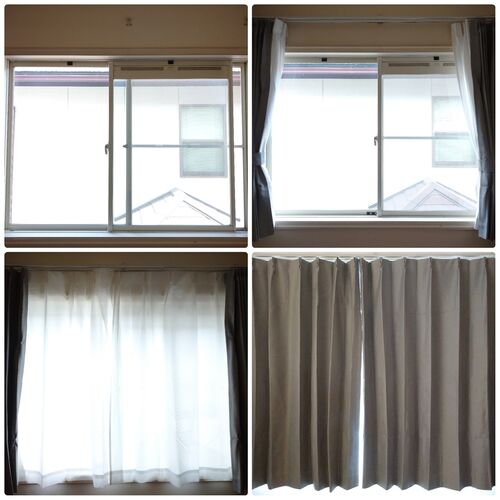 元々シャープシェード(紐で上下に開閉するカーテンのようなモノ)だったけど、生地がボロボロになって風が吹いた時に破れてしまったので普通のカーテンにリプレースした。 レースカーテンはUVカットとか遮熱とか、 ドレープカーテンは遮光とか遮熱とかの機能…