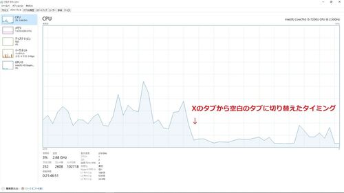 OS:Windows10 Chrome:115.0.5790.171(Official Build) (64 ビット)ファンの感じからCPUの使用率が高そう?と思っていろいろ調べてみたらChromeが使ってて、X(Twitter)のWeb画面のタブがアクティブの時と、空白のページのタブがアクティブな時で10~15%く…