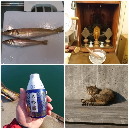 時期的に早いかなぁ~と思いつつ。 3回のアタリで2つ。太陽が上がっても、気温の割にはヒンヤリした風で、まだまだかな? それから、今年初釣行だったので、海にお酒をお供え。