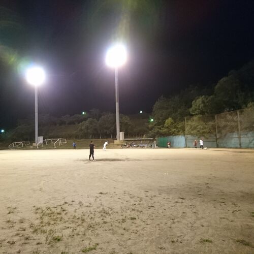 ナイターで野球の練習⚾ 今日も球拾いと草抜き🌱 内野は昨日から今朝の雨が結構降ったせい?で川になった跡があるし、外野はポツポツと足引っ掛けそうな草が生えとるし💀