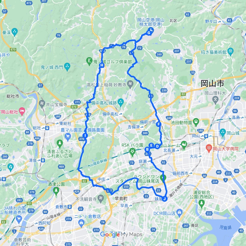 自宅ー吉備津彦神社ー岡山空港ー足守ー鬼ノ城登山口ー県立大ー国分寺ー浅原ーマスカットスタジアムーコンベックスー自宅