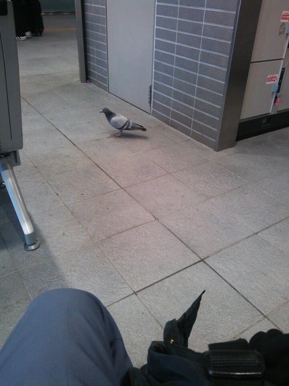 岡山駅で乗り換えで待合の席に座ってたら、股の下から何か出てきた!?と思ったら、ハトさんだった。