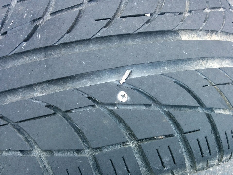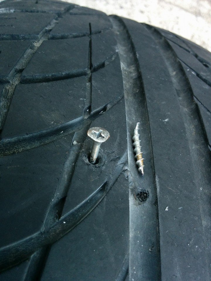 空気の漏れてたタイヤ外したら、また根性の悪そうなネジが突き刺さっとる( ゚д゚)