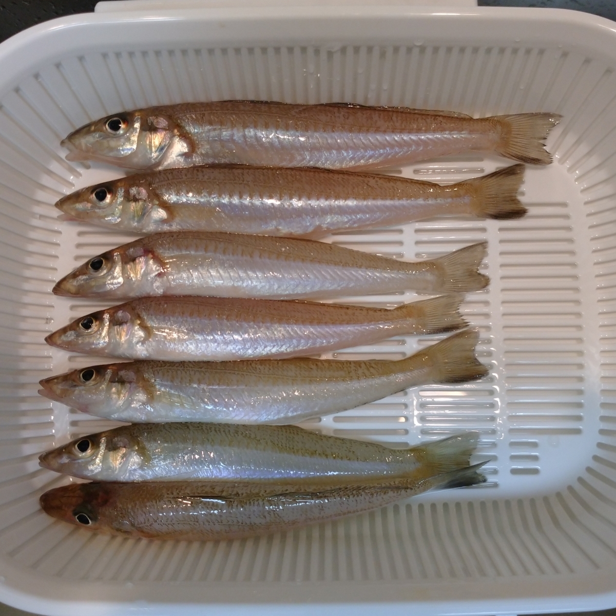 2021-09-16 キス釣り🎣 釣り キス 潮も長潮で風も吹きそうな予報で、ボチボチな感じで出掛けて、7月より少し大きく?太く?なったのを7つ。 8時台はほぼ毎投アタリありで5つ、9時台1つ、10時台1つ、11時台0で、満潮05:40→干潮12:35な潮で引いてからは殆ど釣れてなくて、”下げ三分”までで釣れてた感じ。